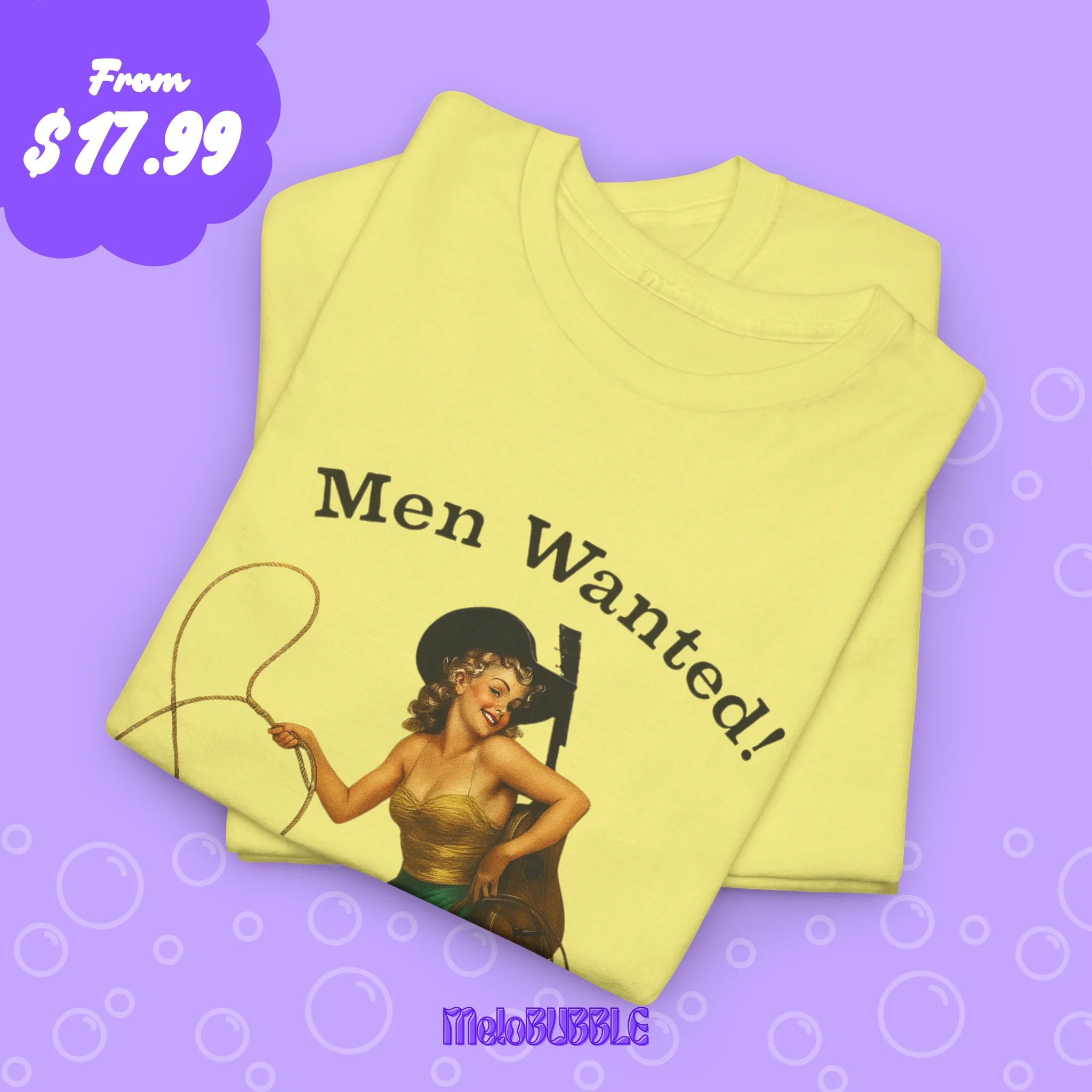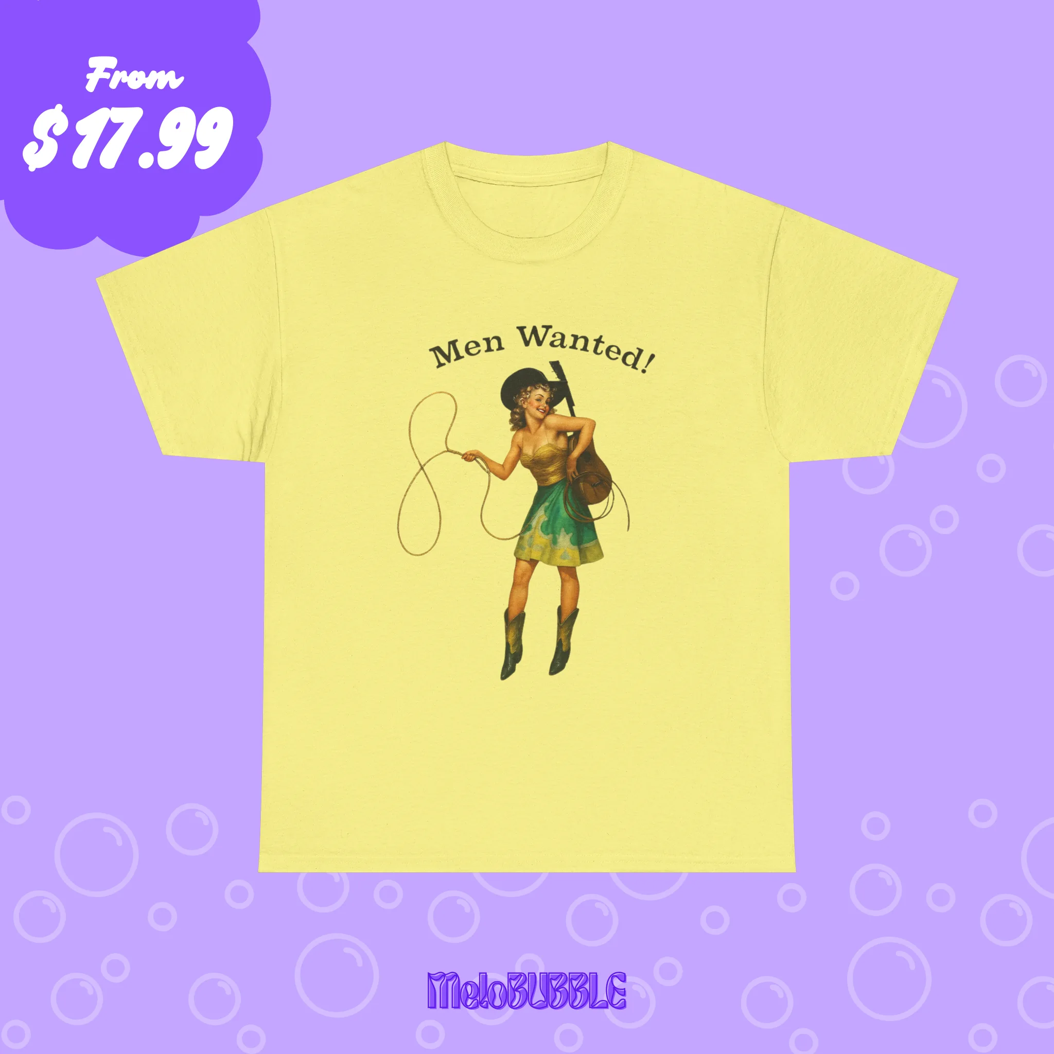 - Playful cowboy design: Bold graphic print with “Men Wanted” energy