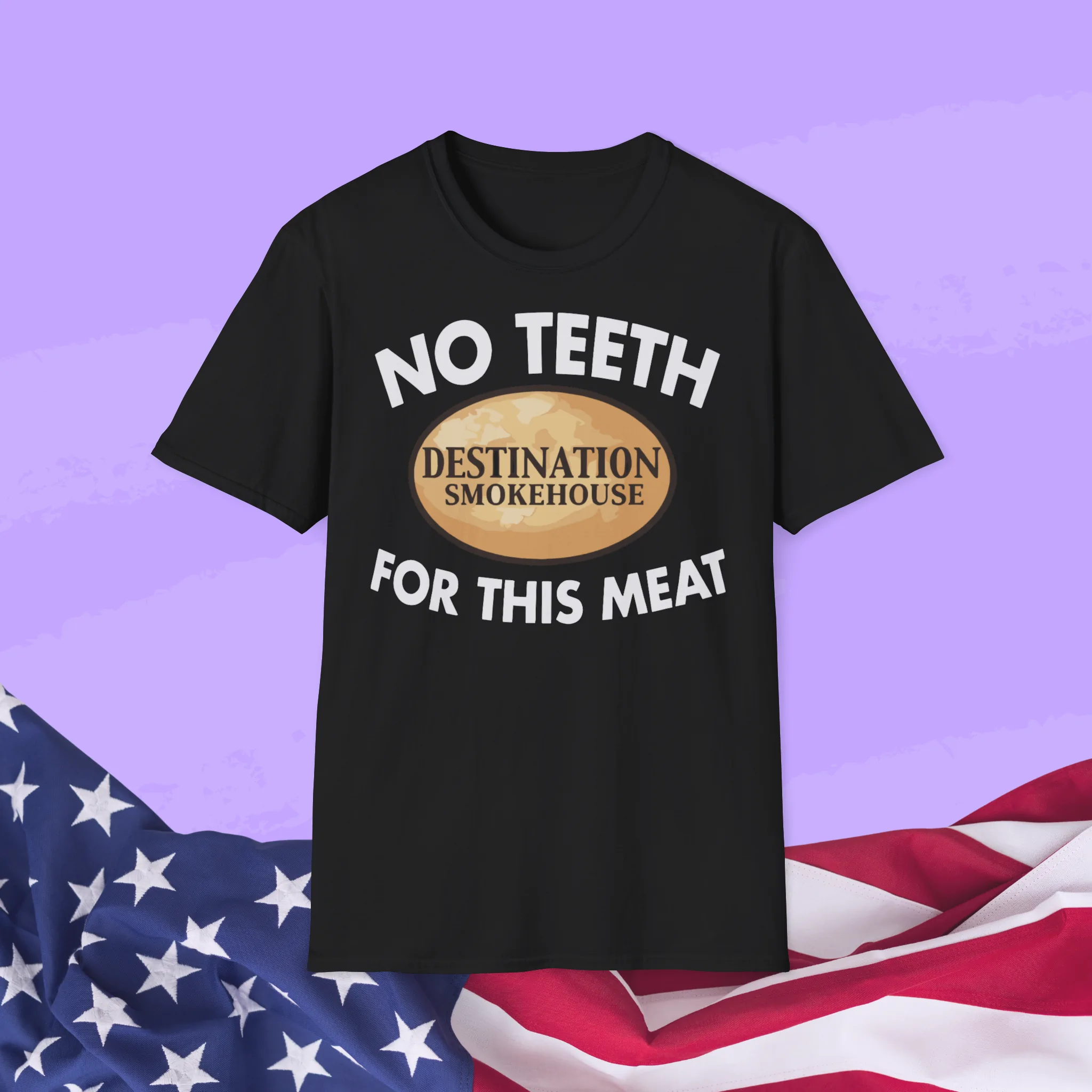 Printed with the unforgettable phrase “No Teeth Destination Smokehouse For This Meat”, this tee looks like it was designed by someone halfway between a pitmaster and a meme lord. It’s rustic, ridiculous, and absolutely perfect for anyone who loves smoked meat, chaotic humor, or both.