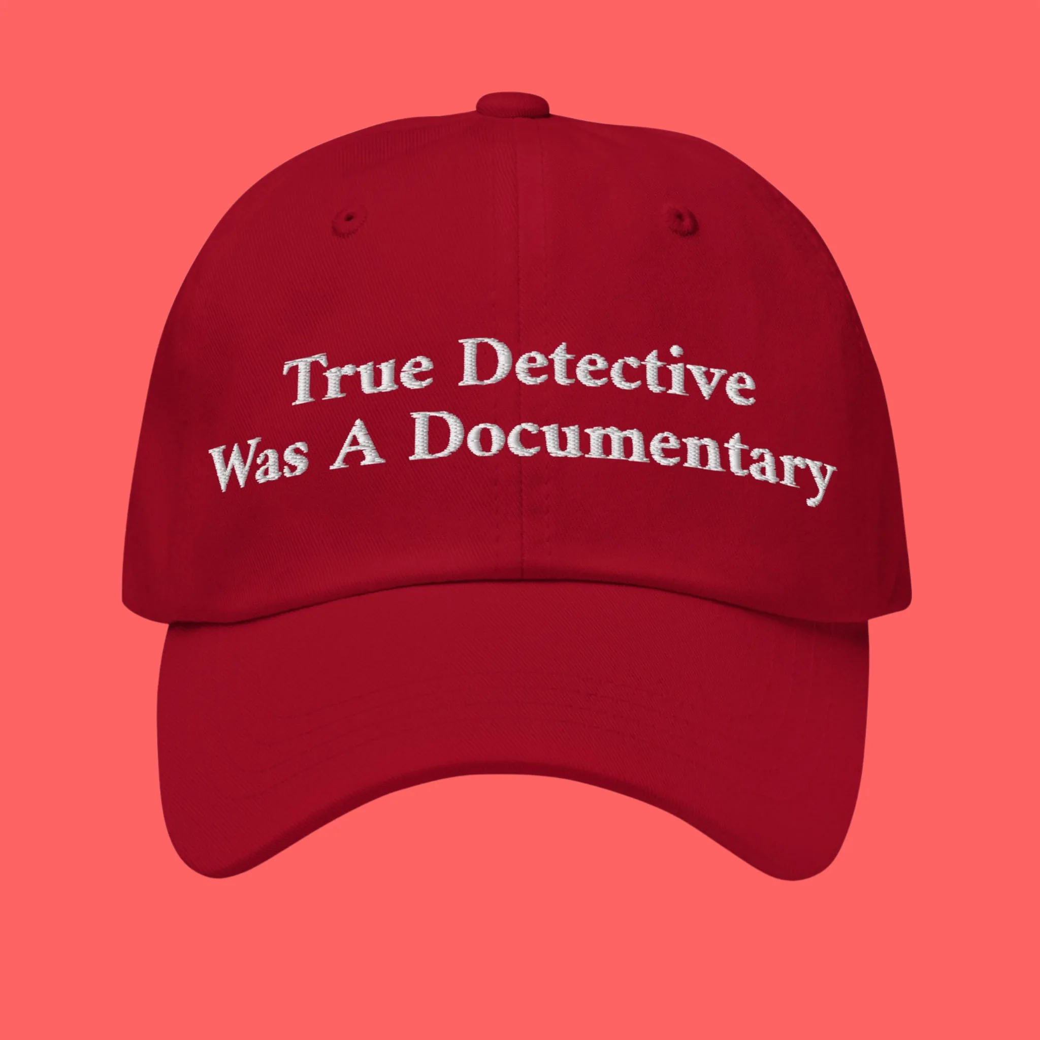 The embroidered phrase “True Detective Was A Documentary” is stitched front and center, turning a TV reference into a wearable conspiracy theory. Whether you loved Rust Cohle’s monologues, the eerie backwoods mysteries, or just the meme-worthy nihilism, this hat captures that same unsettling energy with a wink. It’s campy, it’s clever, and it definitely makes people do a double-take.